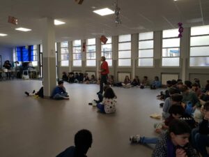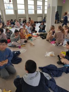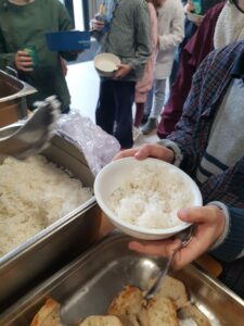 Munis de leur bol et de leur cuiller apportés de la maison, les enfants se sont retrouvés tous ensemble dans la salle polyvalente pour partager un repas simple et fraternel. Au menu : du riz accompagné d’une sauce tomate, suivi d’un fruit en dessert. Un repas volontairement frugal, vécu dans un esprit de recueillement et de générosité.