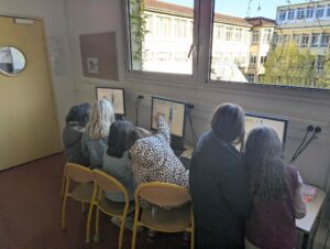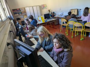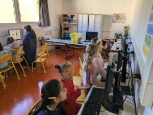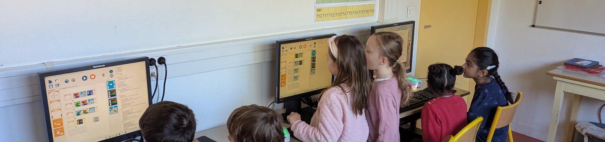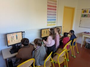 Après trois séances de programmation directe sur le robot à l’aide de ses boutons, les enfants ont découvert une nouvelle manière de programmer : en connectant les robots aux ordinateurs de la salle informatique grâce à des câbles USB.
