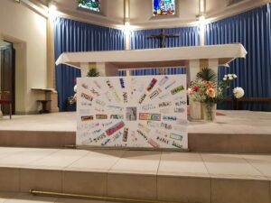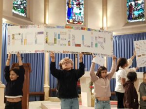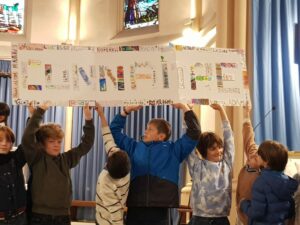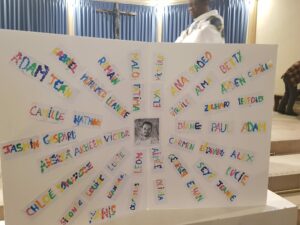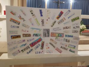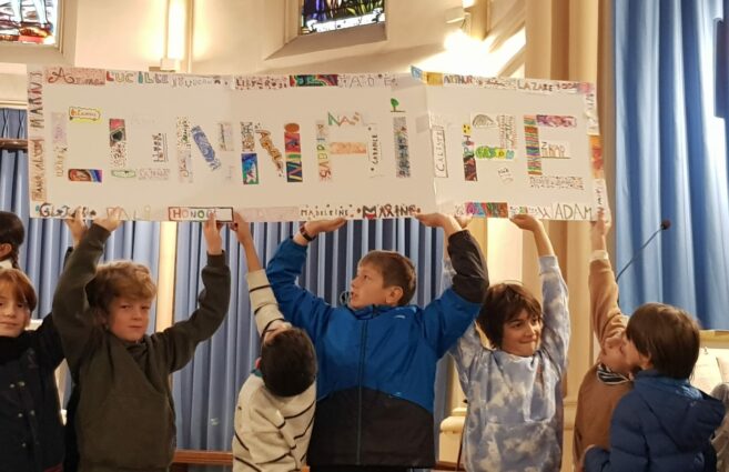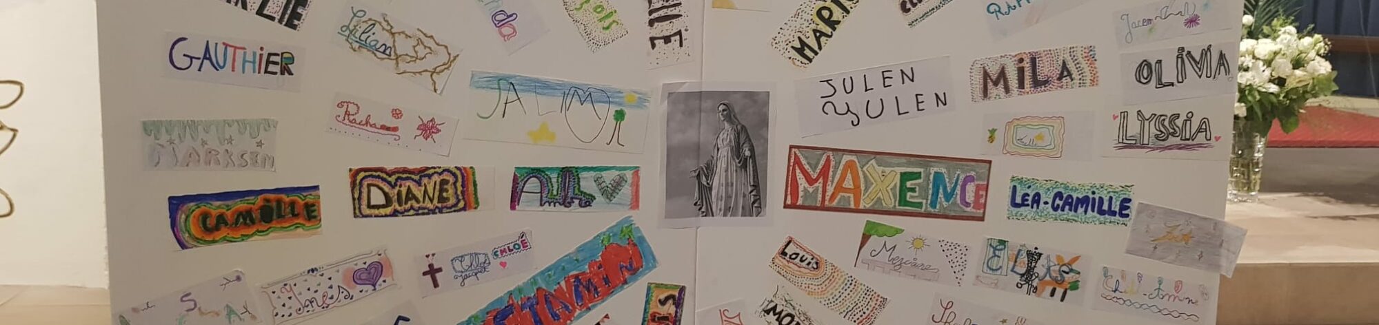 Un panneau de prénoms, réalisé par tous les élèves, a symbolisé l’unité de l’école : chaque prénom représente une pierre vivante de notre communauté.
