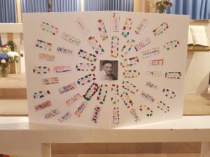 Un panneau de prénoms a symbolisé l’unité de toute l’école : chaque prénom représente un enfant accueilli et aimé. La célébration s’est terminée par la bénédiction des élèves et le chant à Marie, « Regarde l’étoile », repris par tous avec joie.