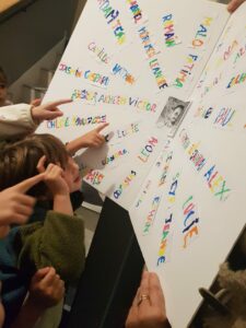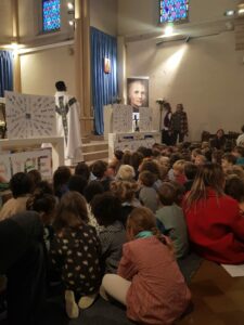Un panneau de prénoms a symbolisé l’unité de toute l’école : chaque prénom représente un enfant accueilli et aimé. La célébration s’est terminée par la bénédiction des élèves et le chant à Marie, « Regarde l’étoile », repris par tous avec joie.