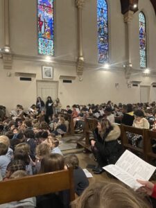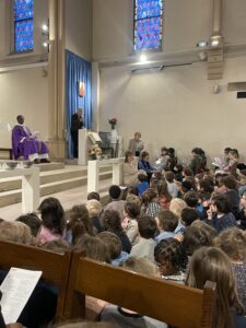 Vendredi 18 février, tous les élèves de l’école se sont réunis à l’église pour célébrer l’entrée en Carême. Accueillis par le Père Eric, ils ont été invités à comprendre ce temps de quarante jours qui prépare à Pâques, à travers les « 4 P » : Prier, se Priver, Partager, Pardonner.