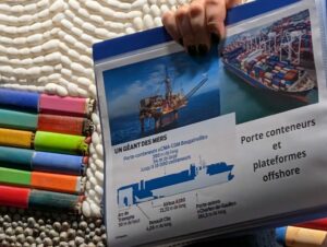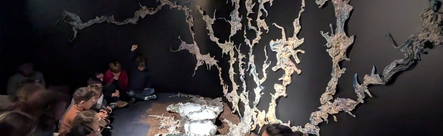 Nous avons commencé par une œuvre qui représentait le parfum de la mer à marée basse. De vrais squelettes de poissons trouvés au fond des abysses étaient présentés. Certains étaient très drôles car ils avaient des têtes très étranges. Ce sont de vrais scientifiques qui les ont prêtés à la MAIF. Les abysses sont un endroit très profond où la lumière du soleil ne passe plus, en dessous de la zone de minuit. L’endroit le plus profond s’appelle la fosse des Mariannes.