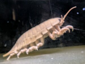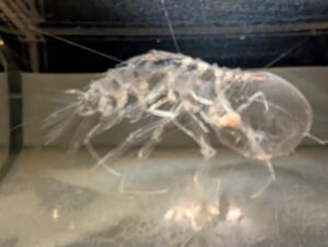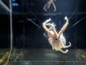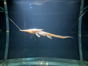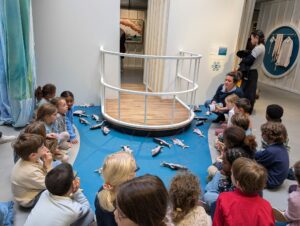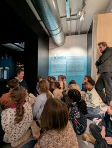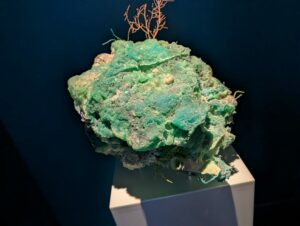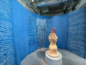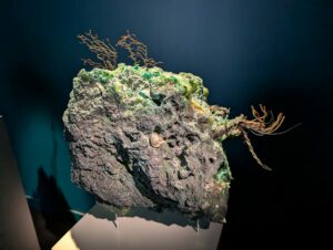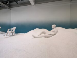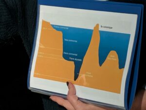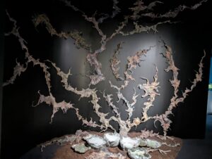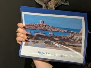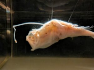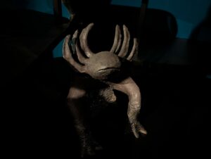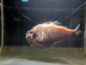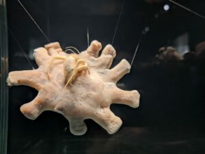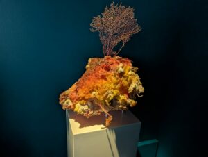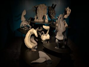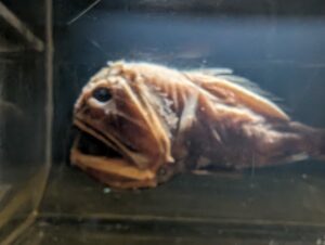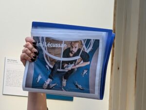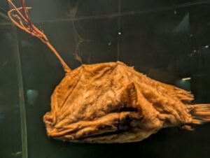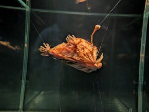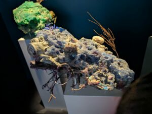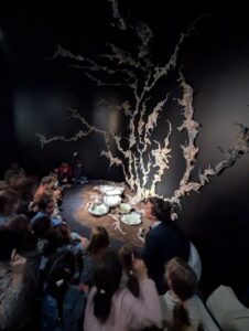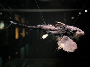 Nous avons commencé par une œuvre qui représentait le parfum de la mer à marée basse. De vrais squelettes de poissons trouvés au fond des abysses étaient présentés. Certains étaient très drôles car ils avaient des têtes très étranges. Ce sont de vrais scientifiques qui les ont prêtés à la MAIF. Les abysses sont un endroit très profond où la lumière du soleil ne passe plus, en dessous de la zone de minuit. L’endroit le plus profond s’appelle la fosse des Mariannes.