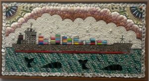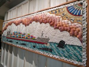 Une autre était fabriquée avec des objets trouvés dans la mer et sur la plage qui représente un cargo en briquets.