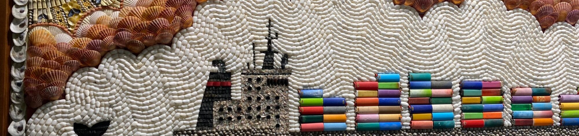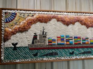 Le guide nous a emmené devant un tableau. Sur le tableau, il y avait des coquillages, des cailloux et des briquets et déchets ramassés sur les plages. Cela représentait un énorme bateau et des baleines. La mer était verte et bleue, le ciel en blanc et rose.