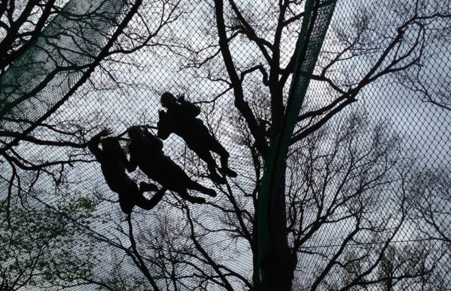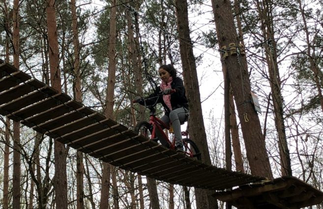 L'après-midi, très belle expérience d’accrobranche pour tous les élèves ! Une première pour certaines et certains. Des sauts de cabris sur des filets hauts perchés pour ceux qui avaient encore de l’énergie. Mention spéciale à Assia qui s’est essayée au vélo dans les airs !