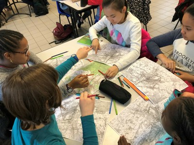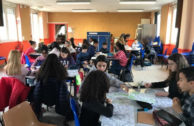 Préparation dans le centre d’hébergement de la visite de la cité royale de Loches, les élèves travaillent sur des cartes IGN et repèrent la topographie des lieux.